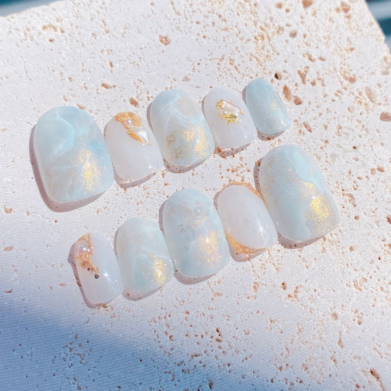 くすみ感のかわいいブルーカラーに、様々なキラキラを埋め込み大理石にしました。