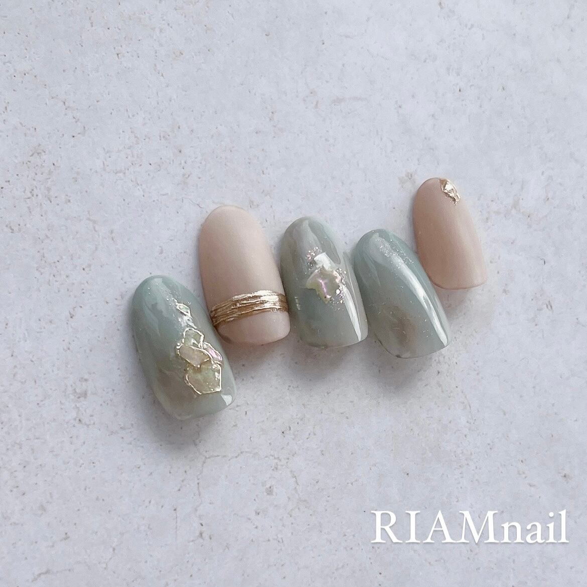当店オリジナルカラーのくすみブルーにグレージュとシェルでまとめた大人かわいいネイルです。肌なじみもよく普段使いにも♡